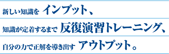 だから、どんなに素晴らしい授業を受けても聞いたことを反復練習しないと残念ながら「できる」ようにはなりません。そこで、真明塾では、「インプット」⇒「反復演習トレーニング」⇒「アウトプット」の3つのステップに基づいた指導を行っています。特に大切なトレーニングに重点を置き、他塾には真似のできない「反復演習トレーニング」を行っています。その結果、子供たちは「できる」ようになり、飛躍的に成績を伸ばしています。自分自身に真に向き合い、ただひたすらに!ひたむきに!問題に一生懸命に取り組んで成し遂げる!これこそが真の勉強であるという考えのもと、生徒たちを指導しています。