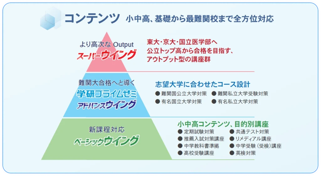 東京大学、京都大学をはじめとする最難関国公立大学や、国公立大医学部医学科への受験対策のためのアウトプット型講座「スーパーウイング」講座を提供。